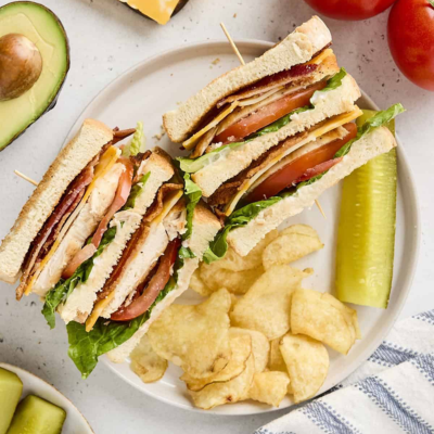 A hearty sandwich featuring tender grilled chicken, crispy bacon, fresh lettuce, tomato, and a touch of mayonnaise, stacked between toasted bread. Perfect for a satisfying meal any time of day.