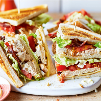 A hearty sandwich featuring tender grilled chicken, crispy bacon, fresh lettuce, tomato, and a touch of mayonnaise, stacked between toasted bread. Perfect for a satisfying meal any time of day.