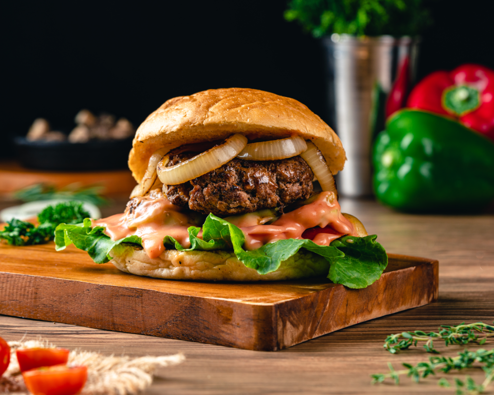 A juicy, grilled beef patty served on a soft toasted bun with crisp lettuce, ripe tomatoes, and a tangy sauce. This classic burger is an all-time favorite that satisfies cravings with each hearty bite.